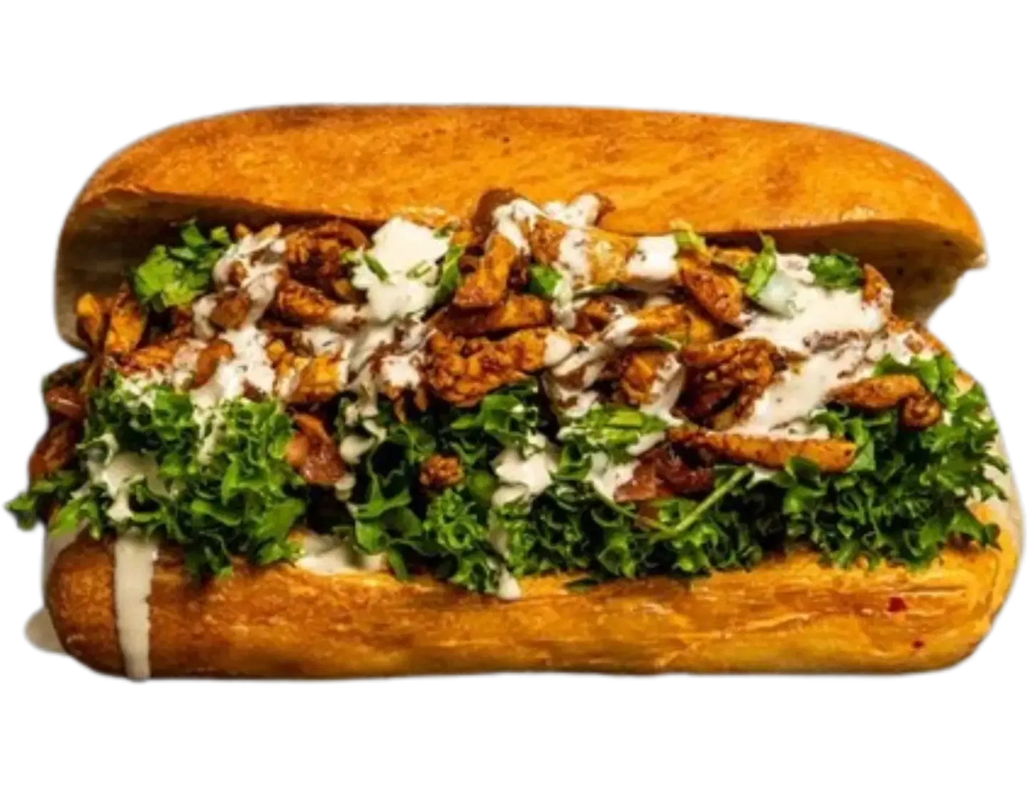 לחם פרנה מוגש עם חסה , עגבניה, רוטב שום, צ׳ימיצ׳׳ורי ורצועות חזה עוף.