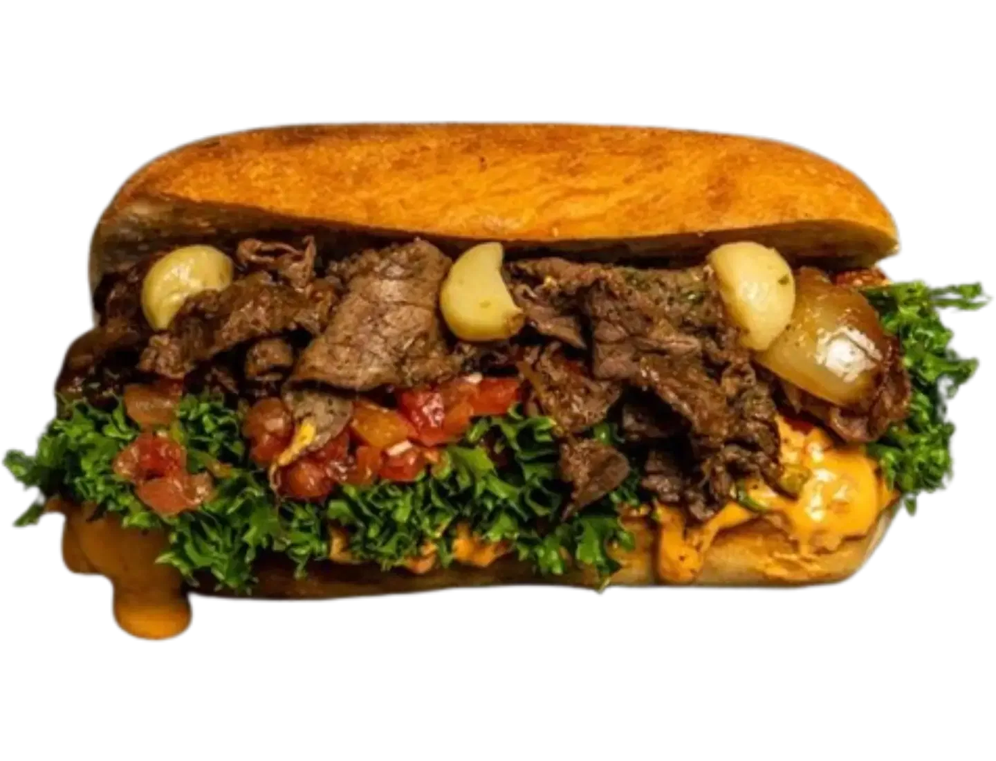 לחם פרנה מוגש עם חסה , עגבניה, רוטב שום, צ׳ימיצ׳׳ורי ורצועות אנטריקוט.